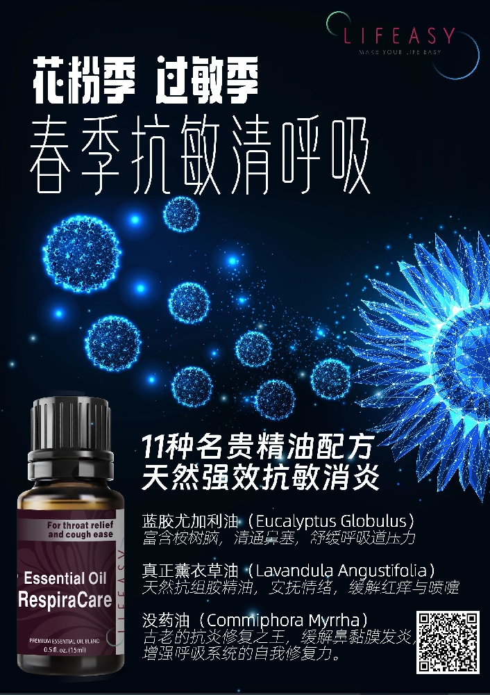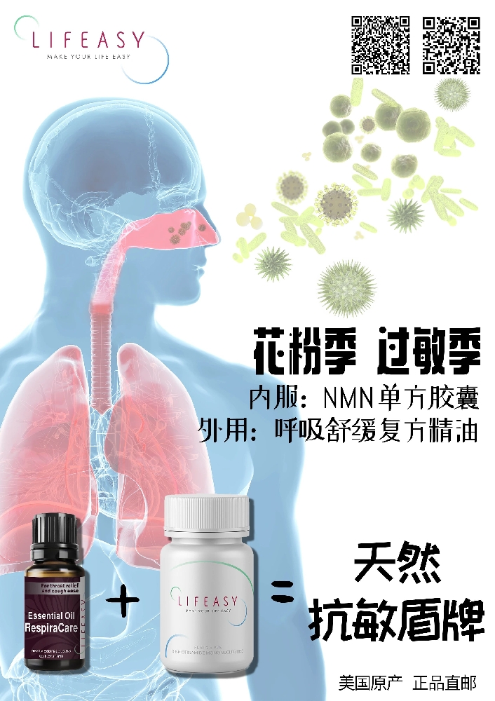美国过敏协会数据显示,75%的过敏患者对药物产生耐受性,每年急诊室有30%病例与过敏并发症有关。今天,我们为你带来【内外兼修】的天然解决方案——RespiraCare复方精油 + Lifeasy NMN胶囊,从根源缓解过敏,内服外用重建清新呼吸!